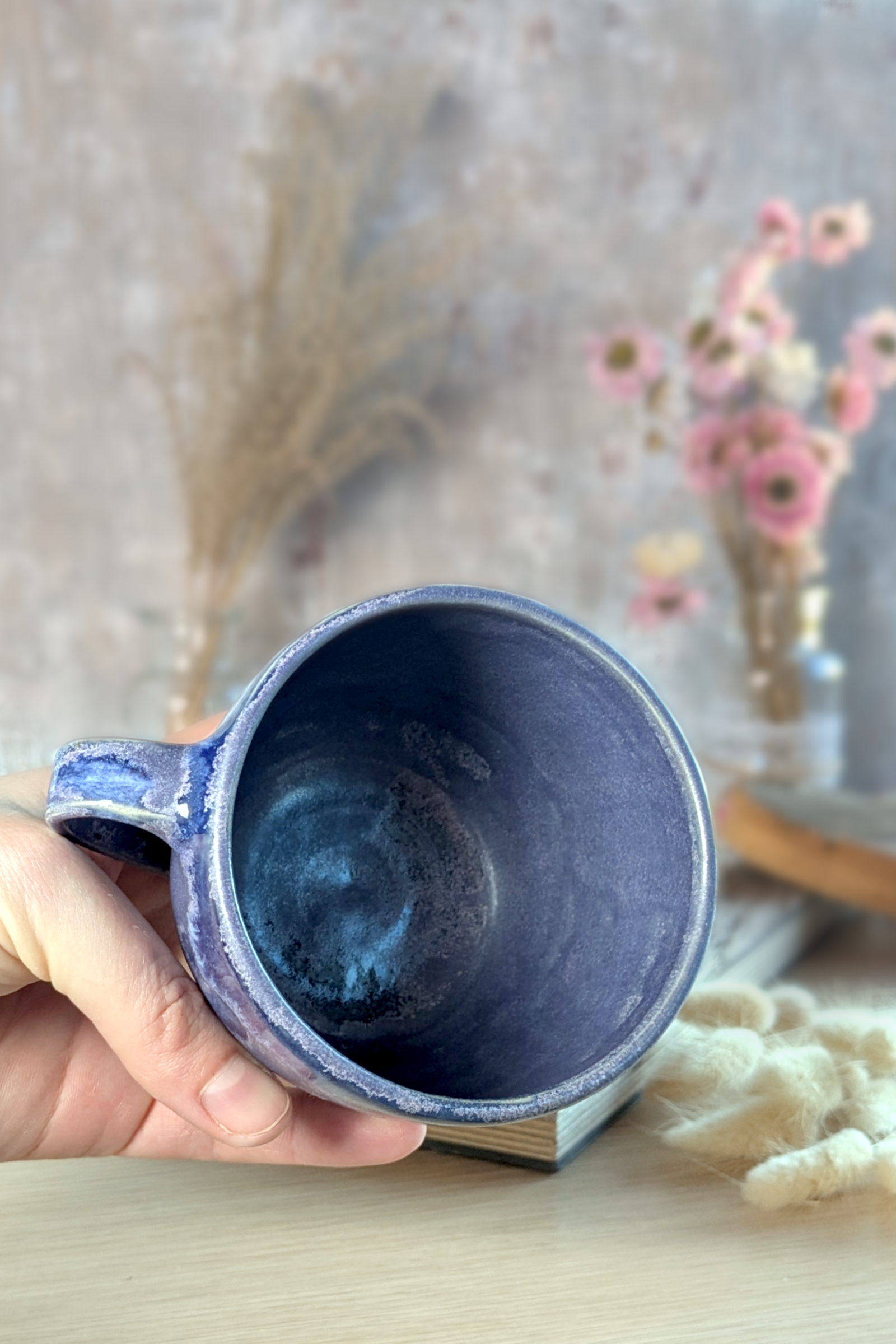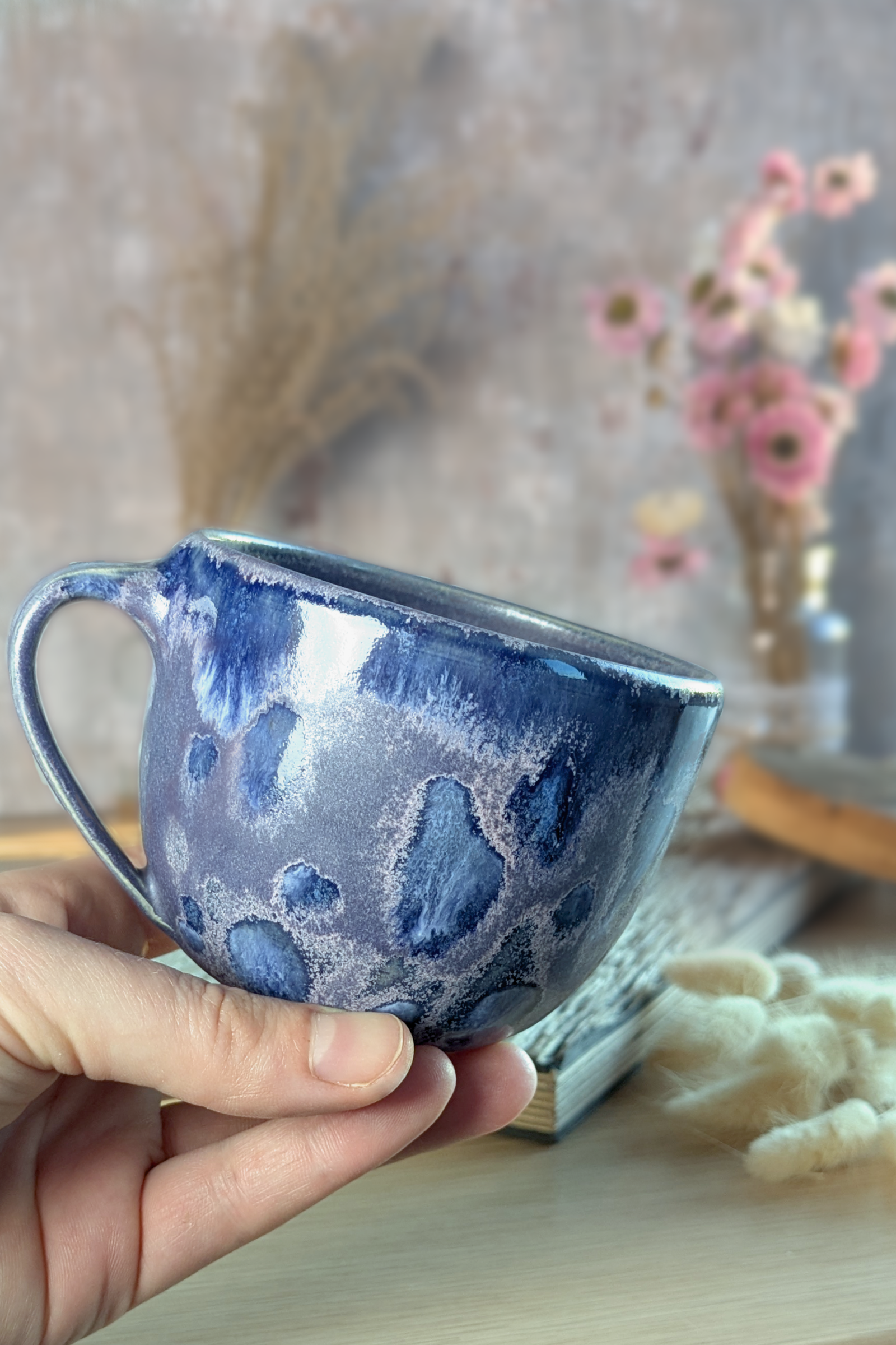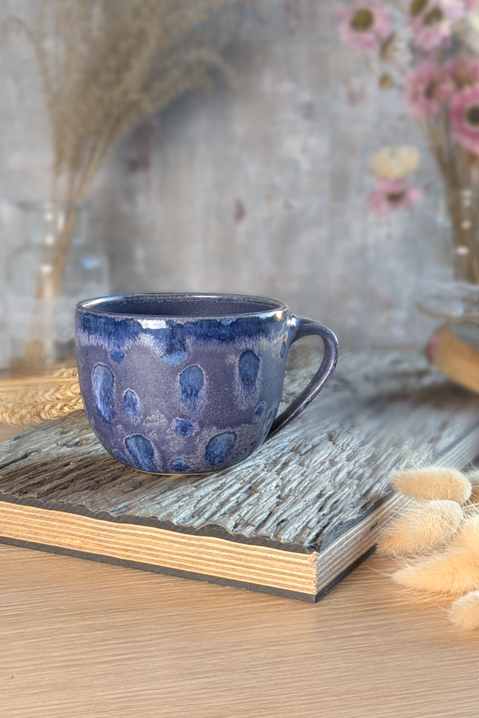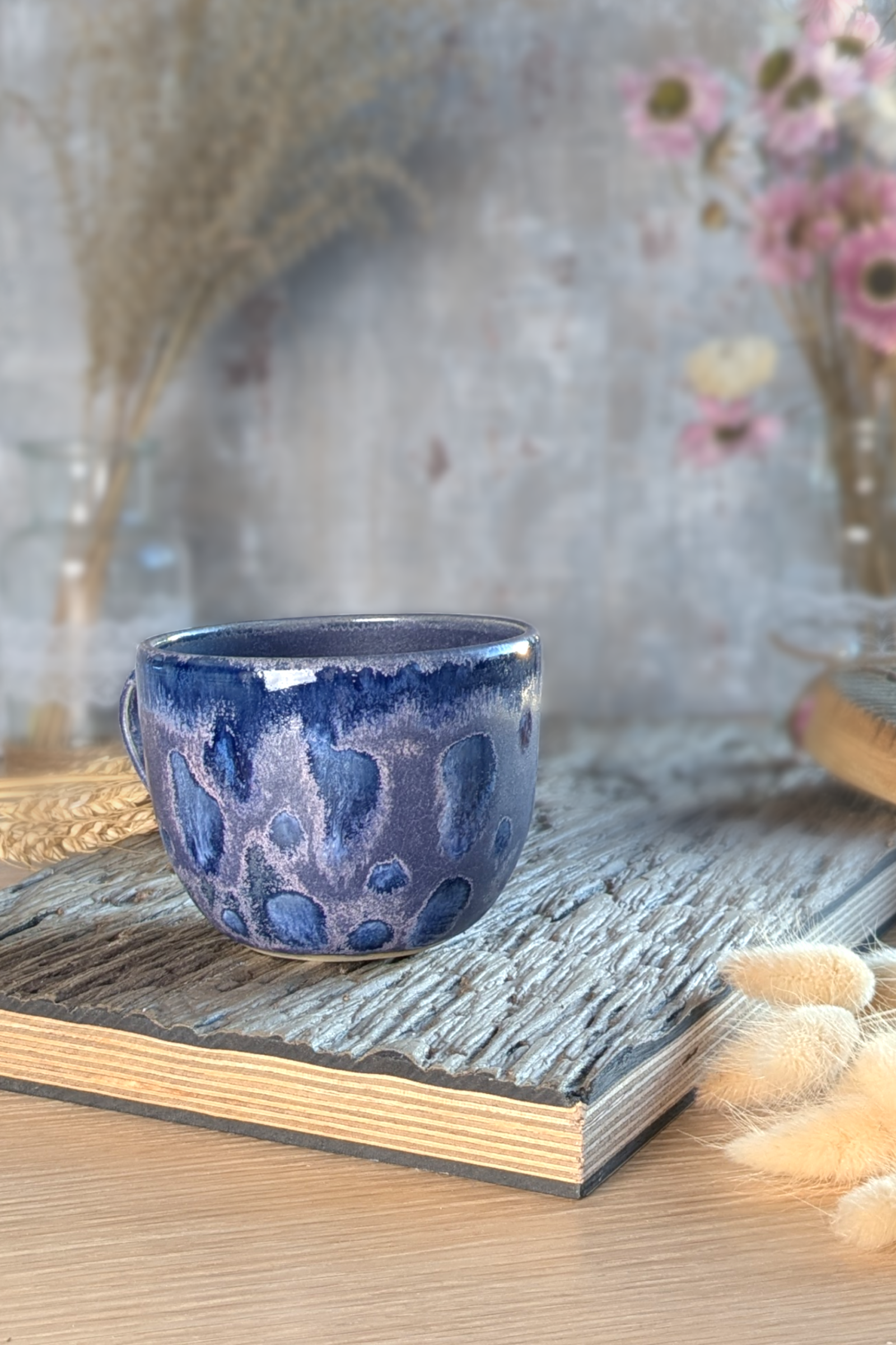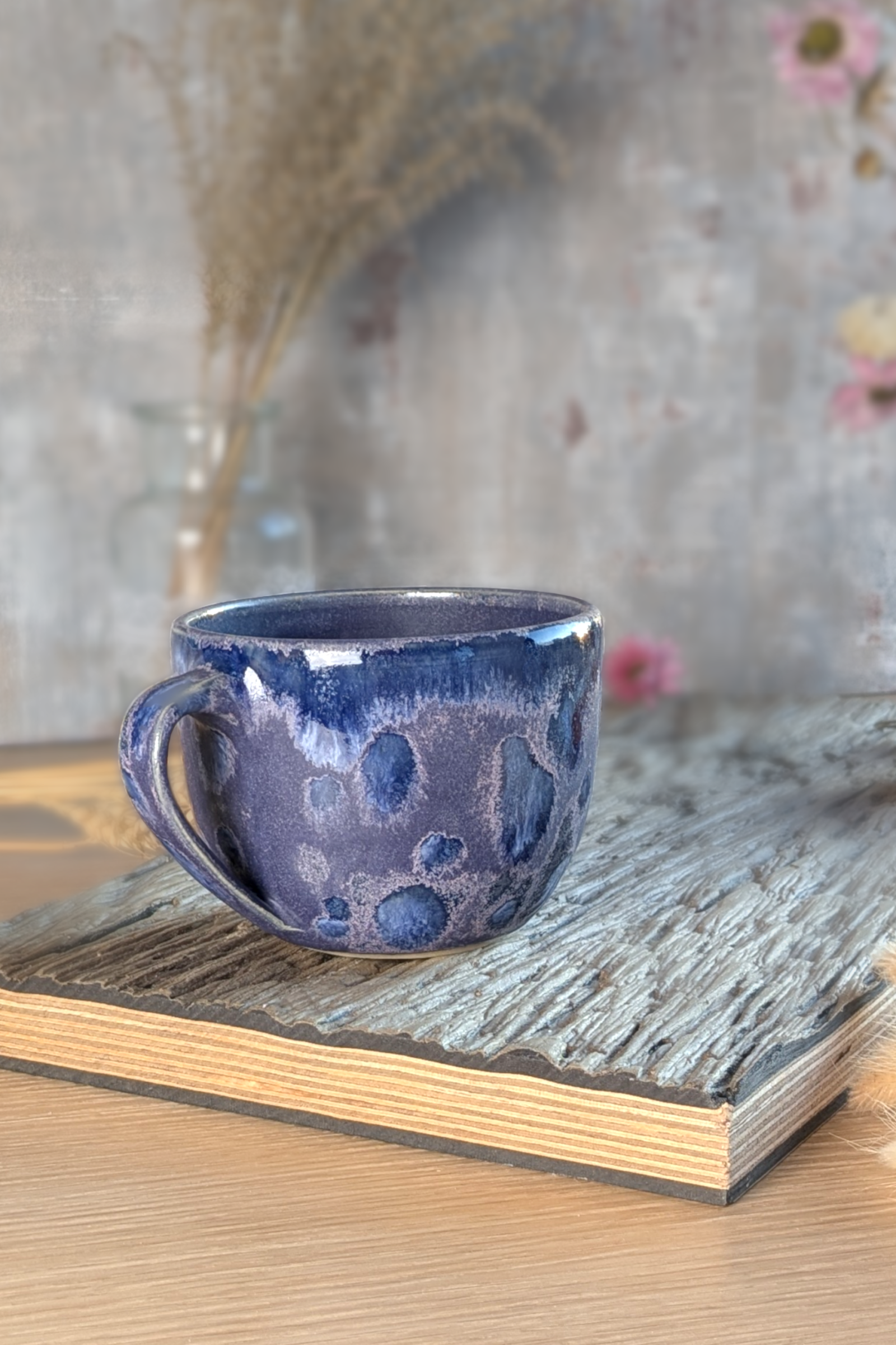 Diese handgefertigte Keramiktasse ist ein Unikat. Sie wird aus Steinzeugton hergestellt und in der lila-blauen Glasur „Purple Rain“ glasiert, die je nach Lichteinfall und Glasurstärke unterschiedlich schimmert. Die Tasse wird im Brennofen hochgebrannt und ist dadurch alltagstauglich.