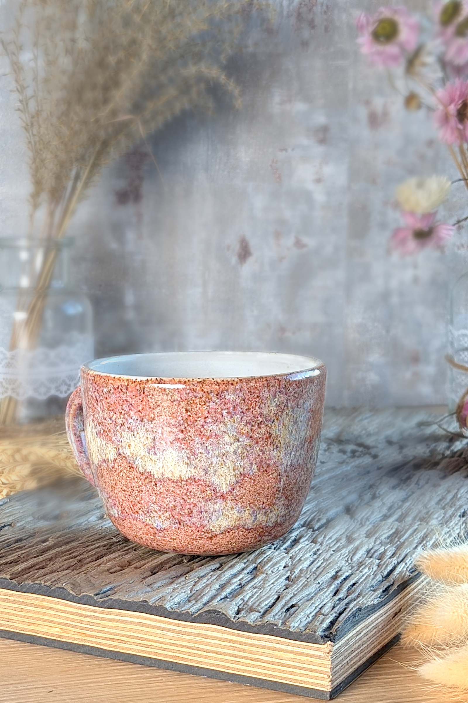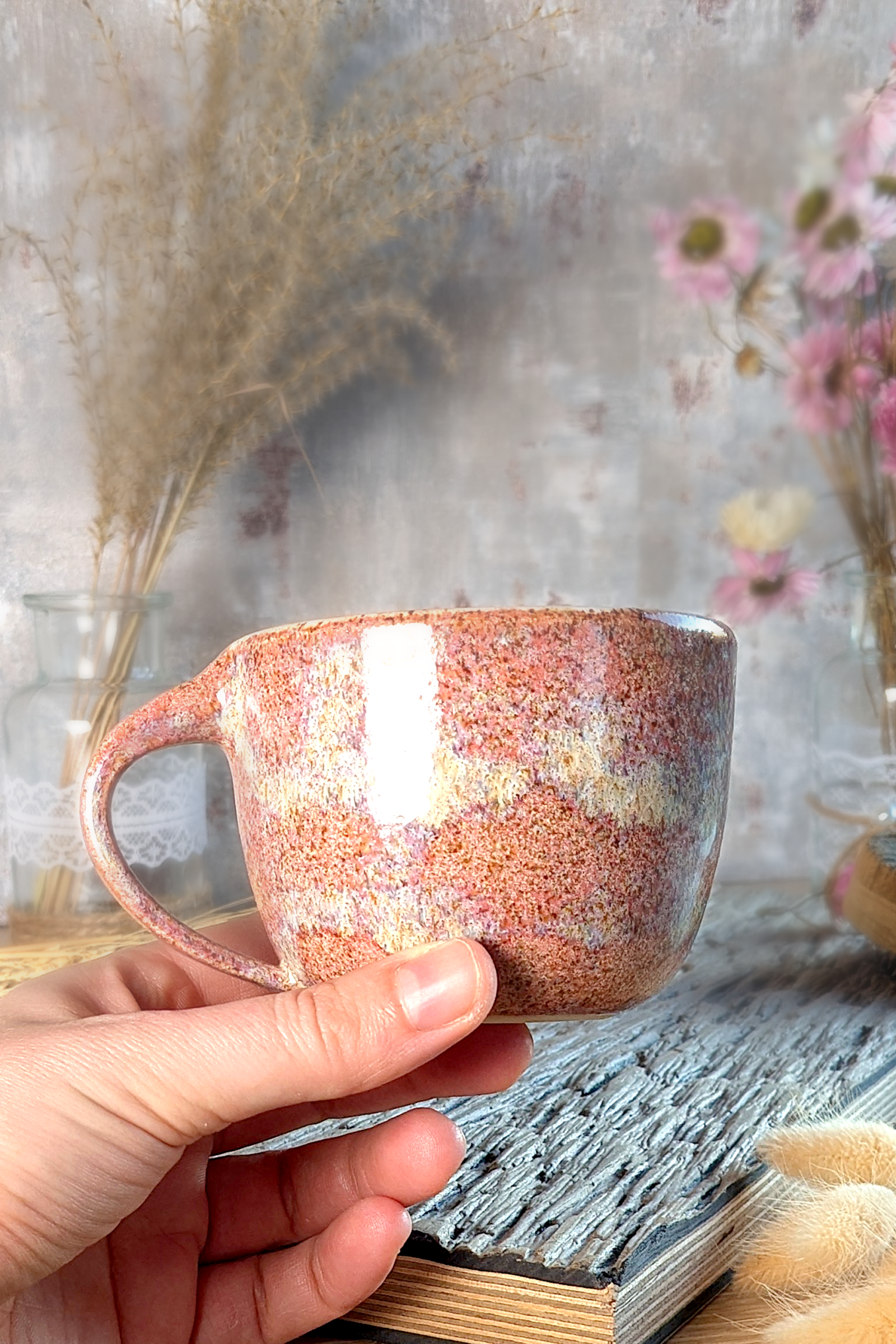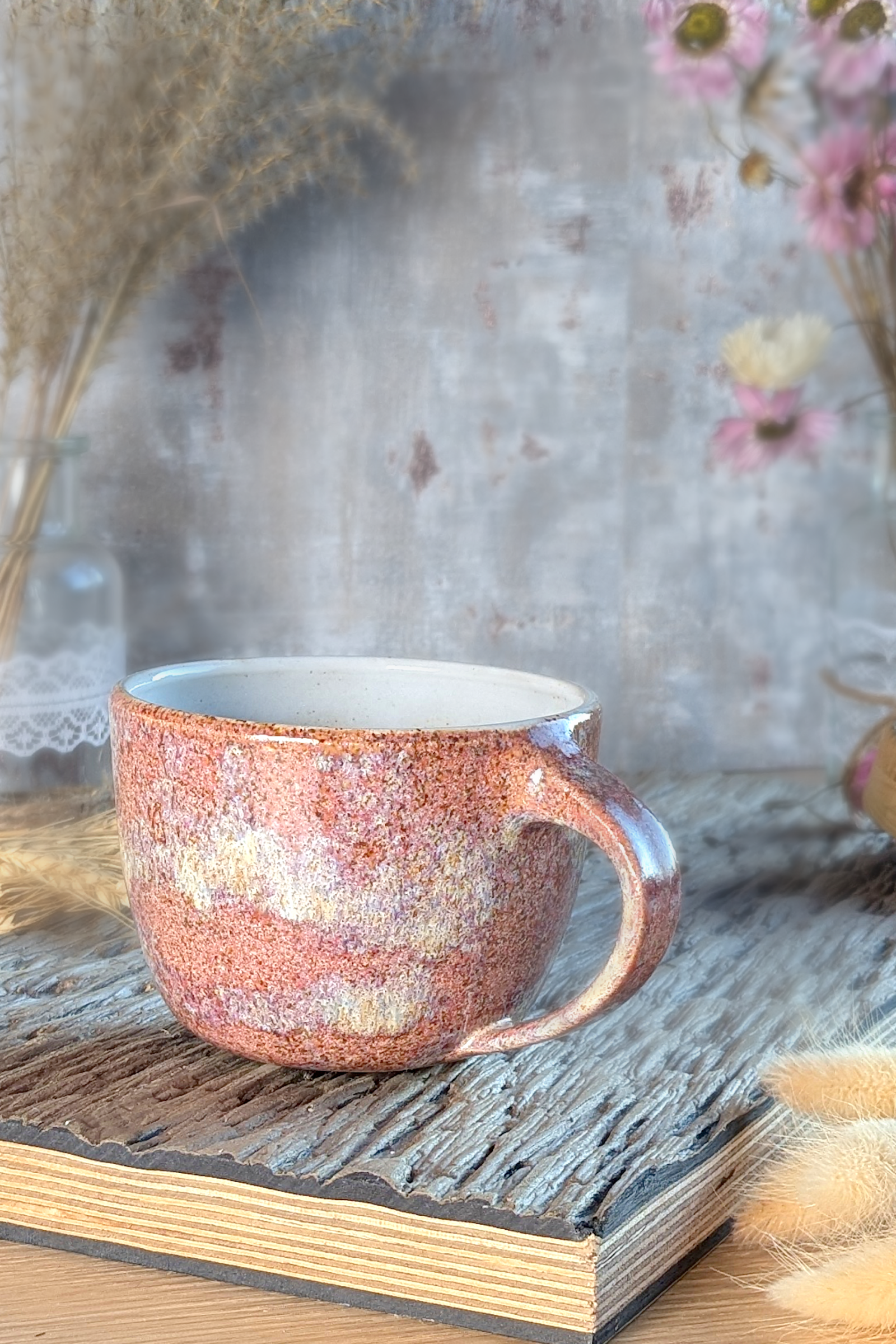 Diese handgefertigte Keramiktasse ist ein Unikat. Sie wird aus Steinzeugton hergestellt und in der rosa-rot-mellierten Glasur „Rose Valley“ glasiert, die je nach Glasurstärke weiß mel Die Tasse wird im Brennofen hochgebrannt und ist dadurch alltagstauglich.